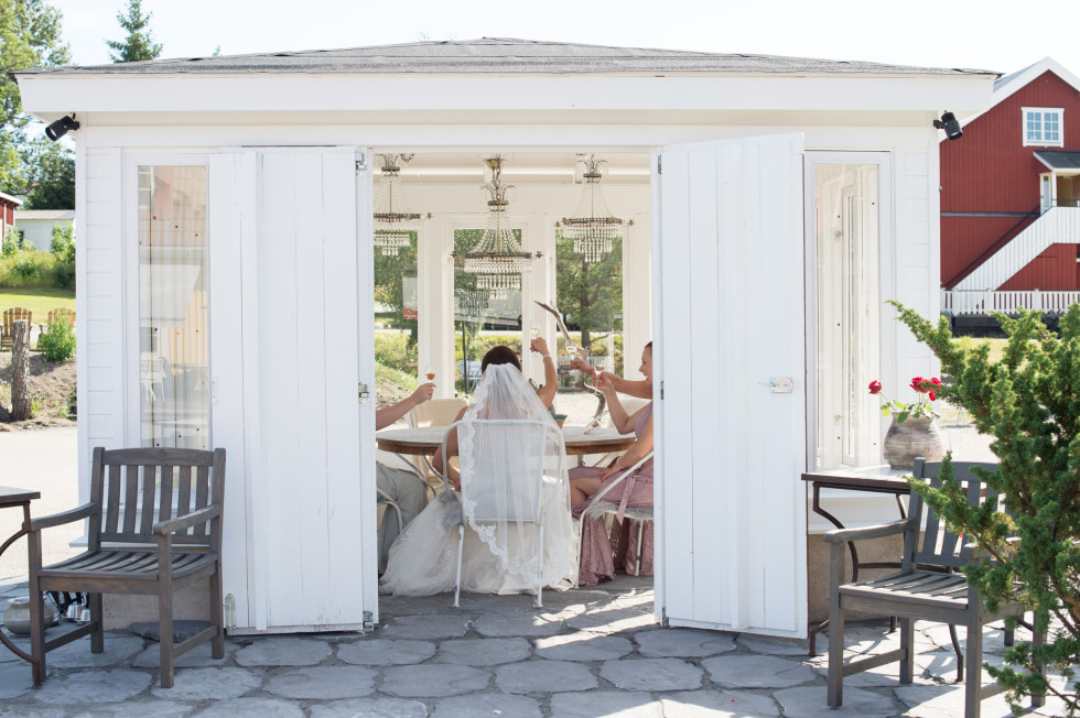 Jag och Vilma hade en mysig frukost och fick sedan hår och smink fixat på hotellet. Vi kände oss konstigt nog väldigt lugna och kunde bara njuta av dagen. Allt var nu klart, klänningen satt perfekt och till och med vädret var på topp. Iväg åkte vi till Sorunda kyrka, en av Sveriges äldsta och vackraste kyrkor. Vid altaret stod Niklas med sina två bröder vid sin sida. Först gick min bästa vän och vår dotter Vilma in, sedan mina två systrar. Jag ser Niklas, vänner och familj som är där för att dela vår lycka, det är en obeskrivlig kärlek som värms i hela kroppen när man går mot altaret. Även solisten sjöng som en ängel. Vi valde att ha två låtar under ceremonin. ”how long will I love you” av Ellie Goulding och ”du är allt” av Sonja Aldén. Utanför kyrkan kastades det rosenblad och small konfetti. Barnen sprang runt och blåste såpbubblor, vilket gav väldigt fina bilder. Vi åkte tillbaka till Körunda för fotografering, medan gästerna checkade in på hotellet, hade tipspromenad och lärde känna varandra.