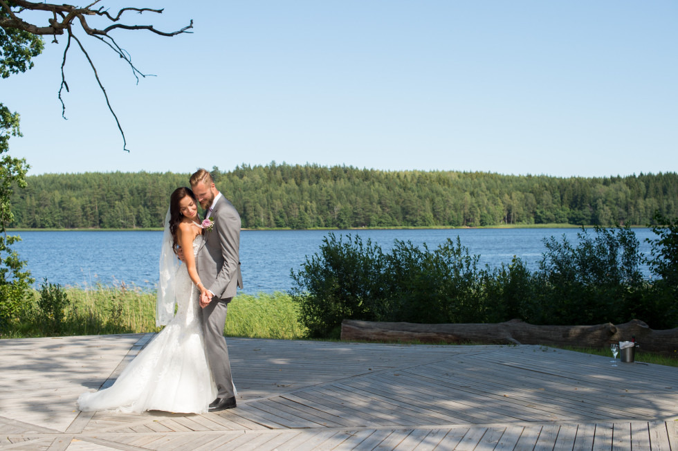 i början av planeringen hade vi inte tänkt så mycket på fotograferingen. Men vi hade fått tag på världens bästa Kristin Andersson ”Kicki fotograf”. Vi hade så roligt med henne och hon lyckades fånga hela dagen från förberedelserna till kvällens solnedgång. Jag måste säga att en bra fotograf är ett måste när man gifter sig, för det är i bilderna alla minnen finns kvar. Under en cykelrunda hade Niklas redan sett ut en vacker plats, som han visade för Kicki. En liten kärleksbro som ligger en bit in i skogen vid sjön Muskan, intill Körunda. Dit fick jag gå med mina höga sidenklackar, poserandes genom trädens grönska. Det var bland det roligaste på hela dagen och vi fick till otroligt vackra konstverk. Vi fortsatte fotograferingen med bubbel och dans på ett trädäck vid sjön.