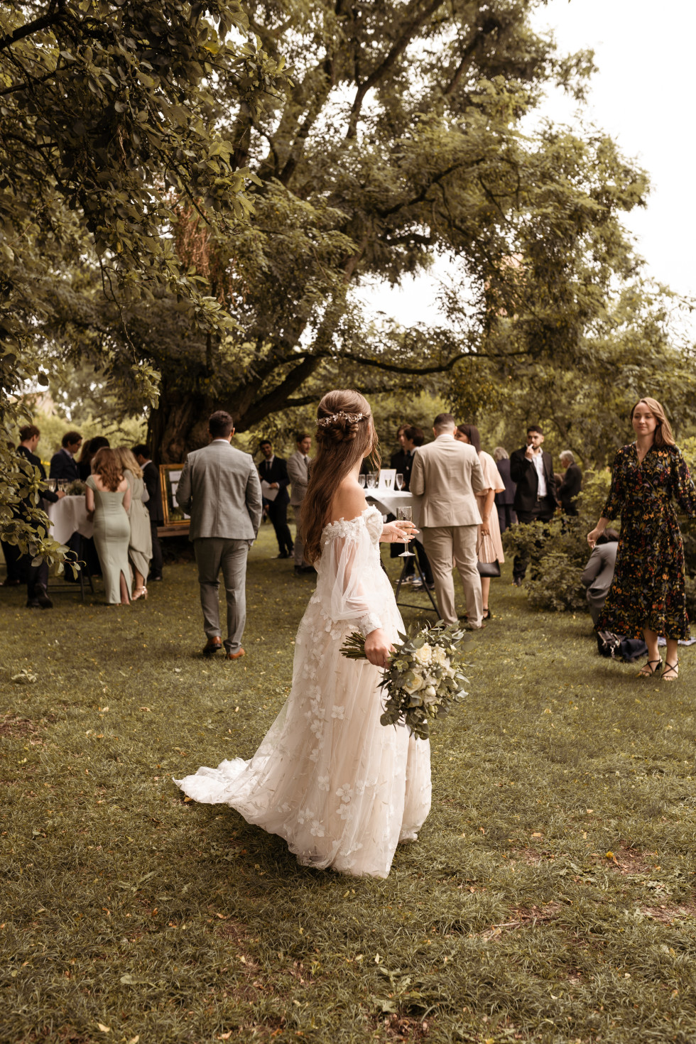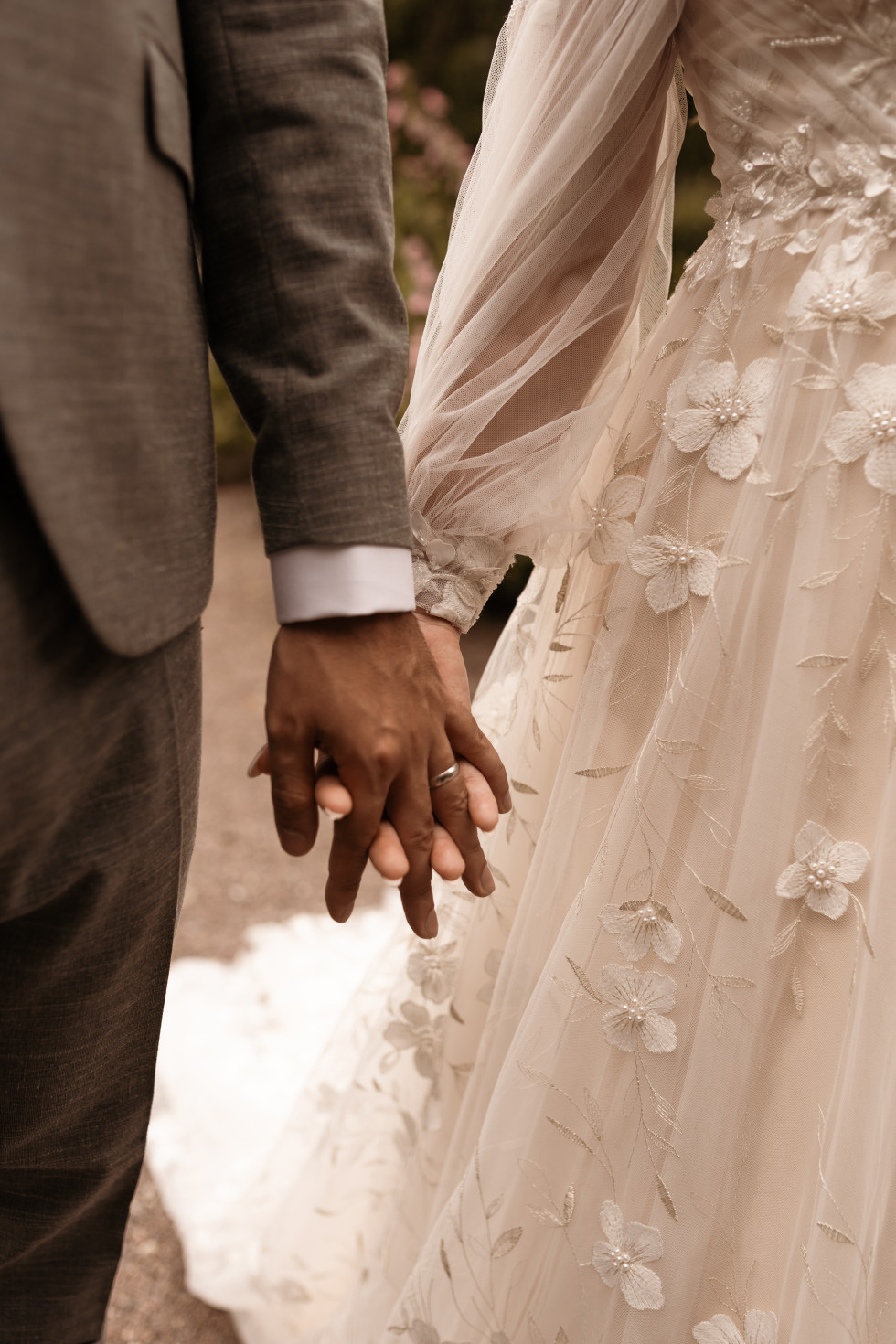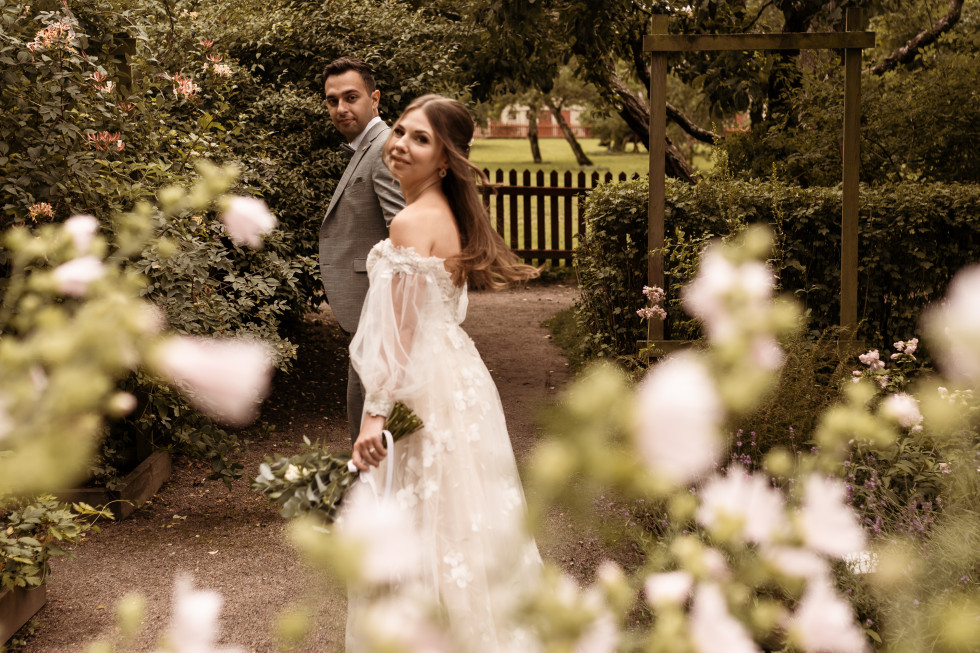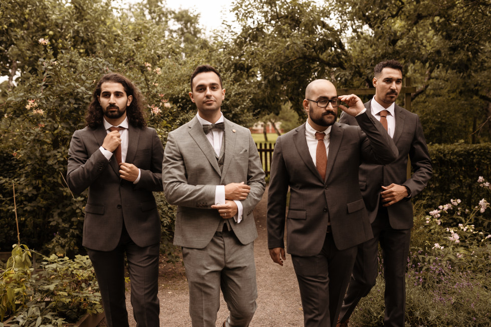 Jag, bruden, bar en klänning som i grunden är från Abby Waits, men som jag sydde om en del. Dels lades ärmar till redan via Abby Waits, men en skräddare hjälpte mig även därutöver fixa till lite olika detaljer – däribland just på ärmarna. Christian, brudgummen, bar en grön kostym från Wedding Bells By Little Fairies.