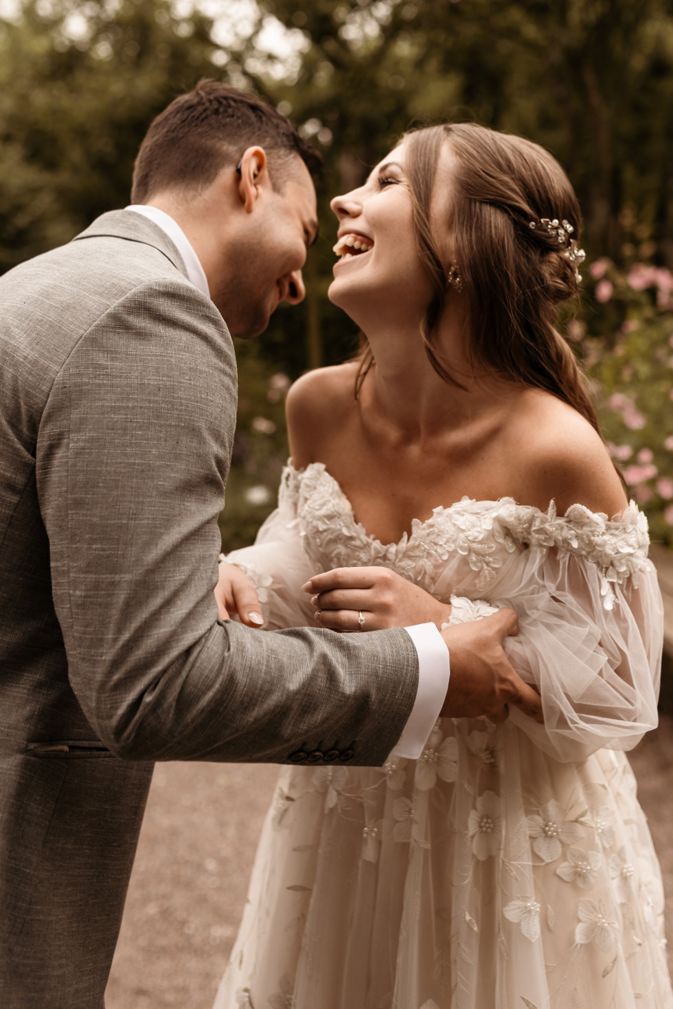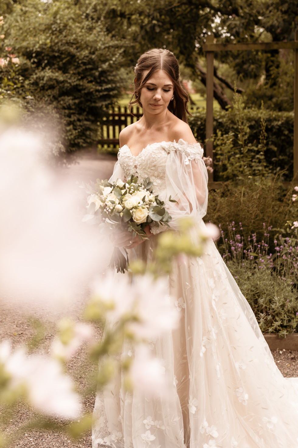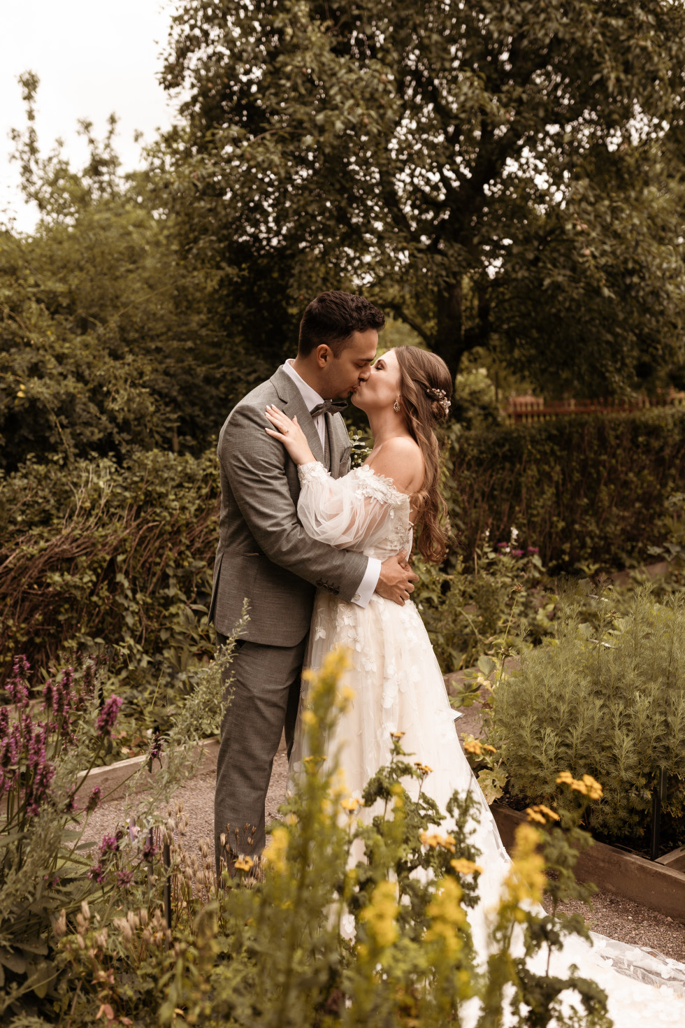 Jag, bruden, bar en klänning som i grunden är från Abby Waits, men som jag sydde om en del. Dels lades ärmar till redan via Abby Waits, men en skräddare hjälpte mig även därutöver fixa till lite olika detaljer – däribland just på ärmarna. Christian, brudgummen, bar en grön kostym från Wedding Bells By Little Fairies.
