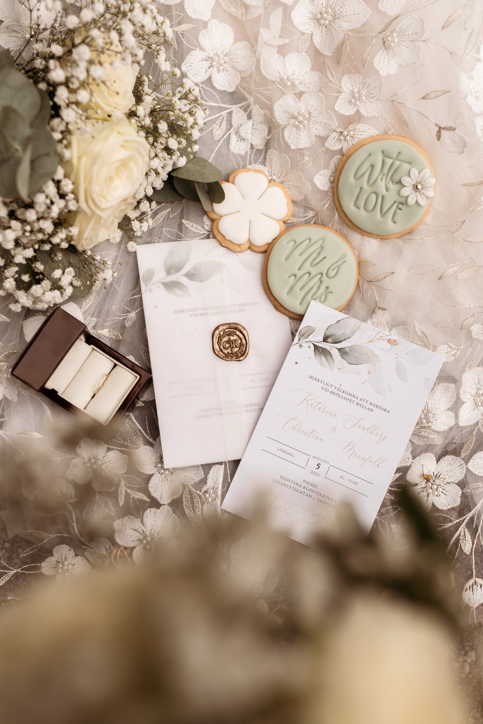 Förlovningsringen valde Christian ut på egen hand (och med lite hjälp av min bästa vän). Det är en guldring med en labbodlad diamant från Kronan Guld i Upplands Väsby. Det var därför naturligt att vigselringen vi valde till mig även den var därifrån – en tunn guldring, halvallians, med labbodlade diamanter. Christians vigselring är en enkel ring i vitt guld.