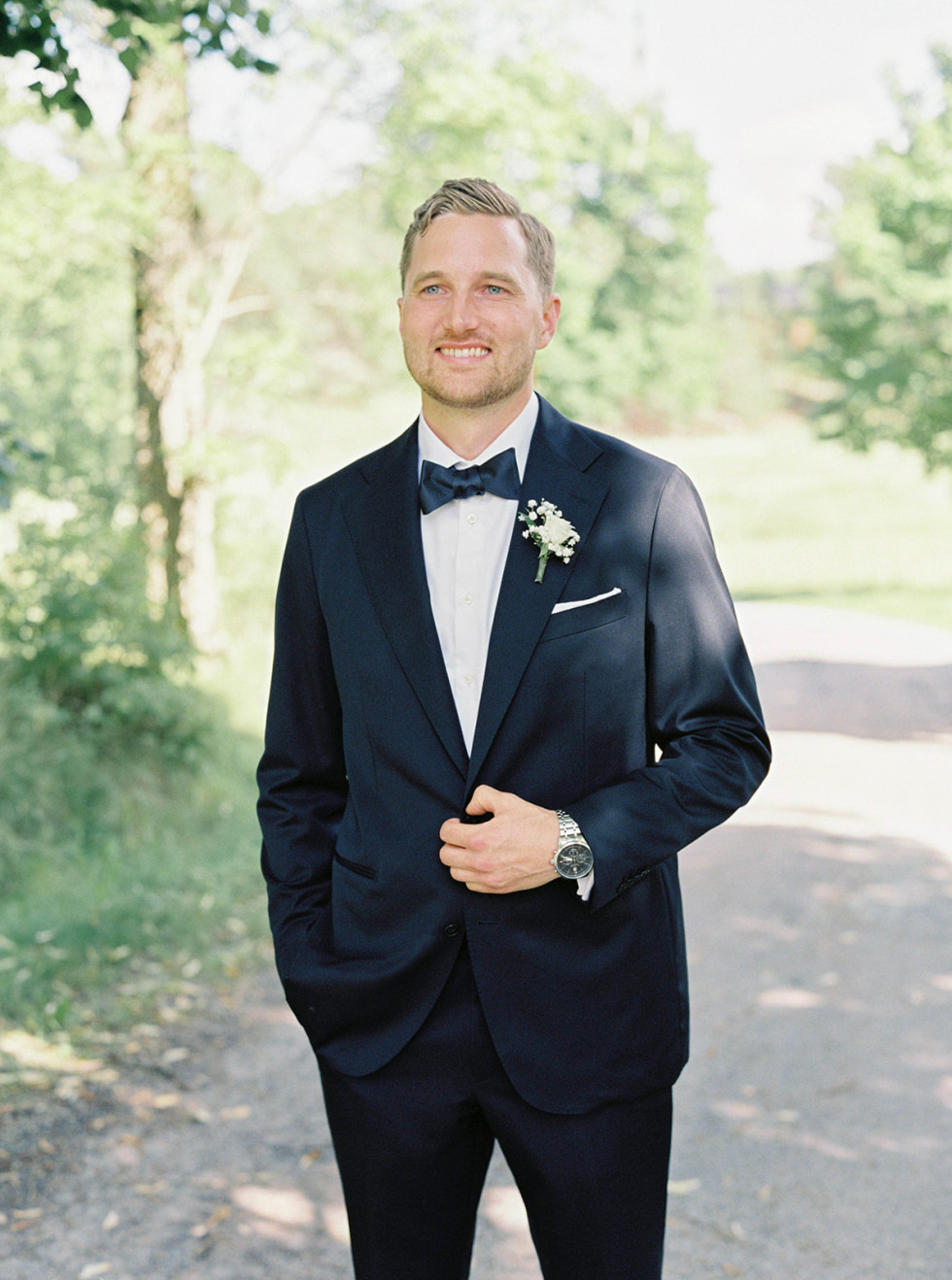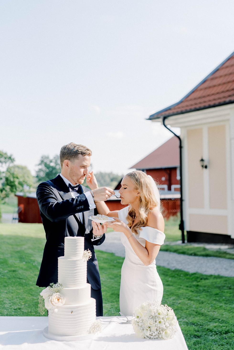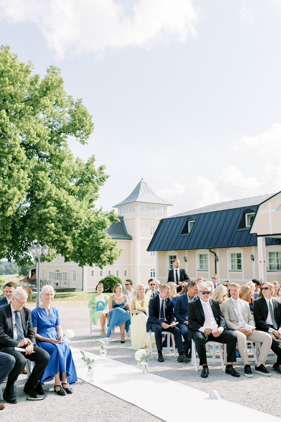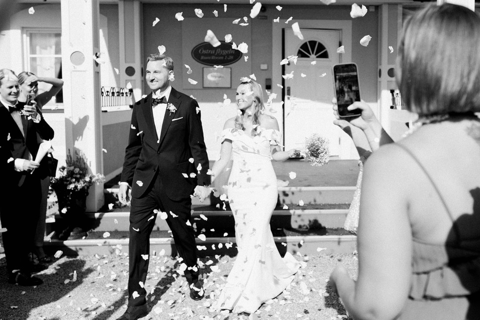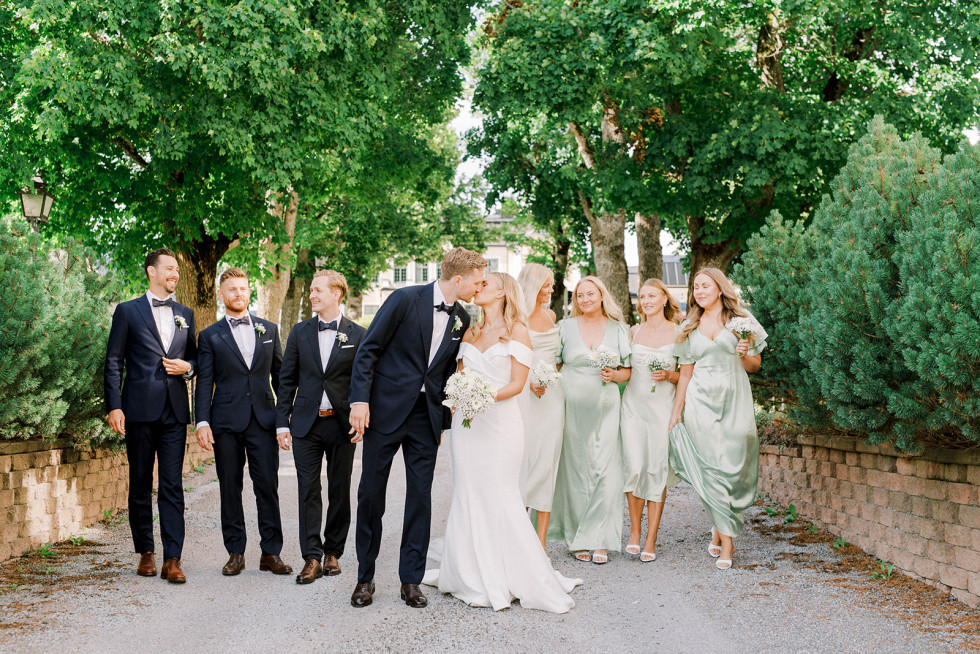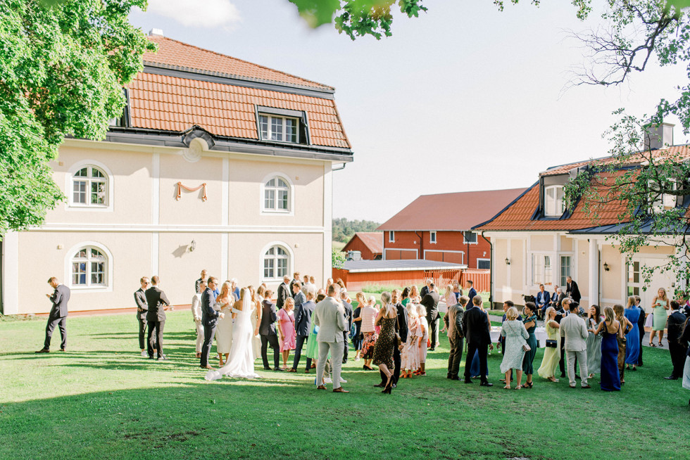 Vi startade helgen med poolparty och mingelmiddag på fredagen, det var supermysigt att få tid att umgås med alla vänner och familj redan dagen innan vigseln. Bröllopsdagen startade med att vi fixade oss på varsitt håll tillsammans med våra tärnor/bestmans. Därefter ägde vigseln rum följt av tårta och brudskål utomhus i slottsträdgården. Bröllopsmiddagen inleddes med shots, ABBA och att alla gäster viftade med vita linneservetter. Middagen innehöll magiska tal, festlig energi och mycket skratt – tusen tack till vårt toastpar som lyckades få till den perfekta bröllopsmiddagen för oss! Middagen avslutades med hot shots, led foam sticks och conga tåg upp till dansgolvet. Dansgolvet stängdes till ”Stad i ljus” och därefter fortsatte efterfesten in på små timmarna. Bröllopshelgen avslutades sedan med en gemensam brunch, perfekt avslut att få skratta åt helgens bravader tillsammans med gästerna.