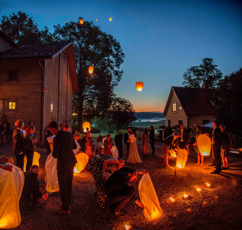 Vi erbjuder en fullt utrustad festlokal med plats för upp till 150 gäster, fördelad över flera våningsplan med scen, dansgolv, terrasser och vigselplatser. Ni får ta med egen dryck och skapa ert drömbröllop med stor flexibilitet. I lokalhyran ingår dessutom boende för upp till 30 personer i två stora hus intill festlokalen, från fredag till söndag.