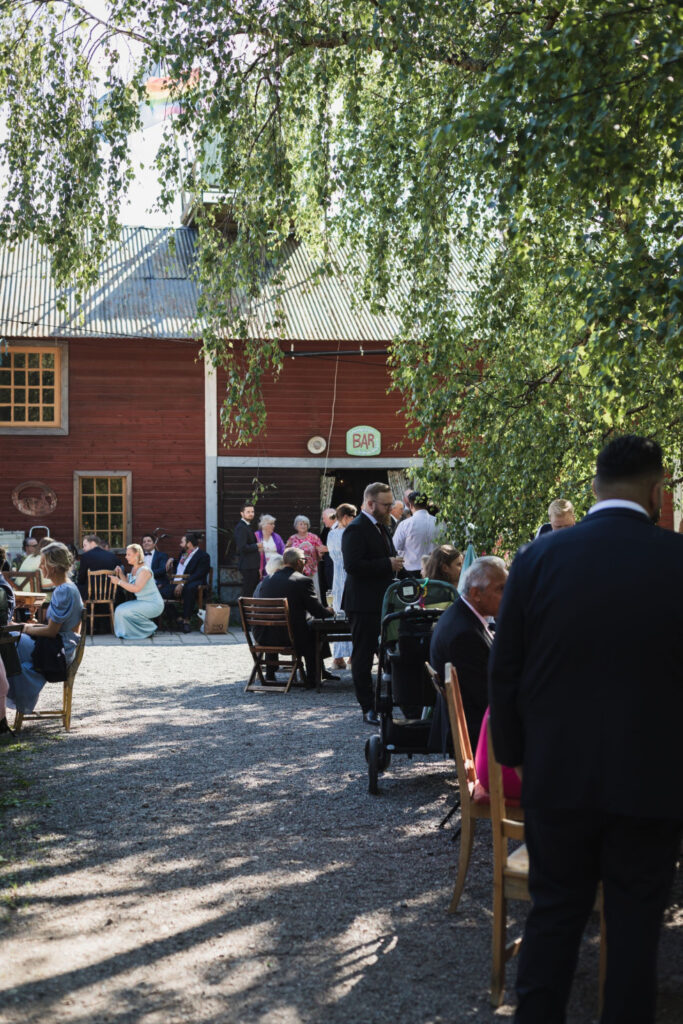 17:00 – 18:15 Brudskål med mingelmat på gårdsplan framför festlokalen med bubbel och snittar. 18:15 Gästerna börjar sätta sig ner.