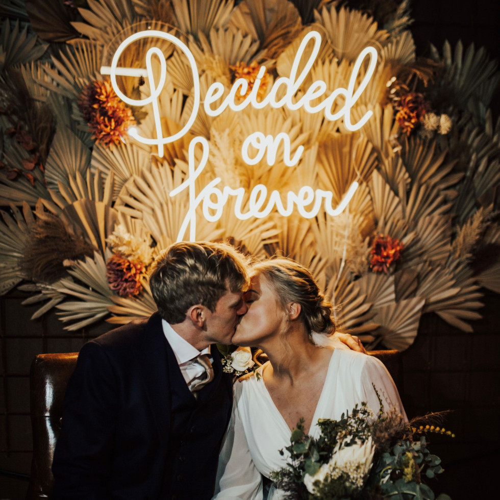 Neonskyltens varma glöd skapar en stämning som känns både sofistikerad och retro‑charmig alfaneon.se+2brollopsmagasinet.se+2amazon.se+2svenskbusiness.se+1signz.se+1. Skylten blir en personlig backdrop för tal, mingel och dans – och ett perfekt fotoögonblick .